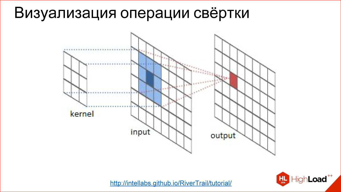 Так это выглядит более наглядно. Есть изображение Input, есть фильтр. Вы пробегаете фильтром по всему изображению, честно перемножаете соответствующие элементы, складываете, записываете в центр. Пробегаете, пробегаете — построили новое изображение. Все, это операция свертки.