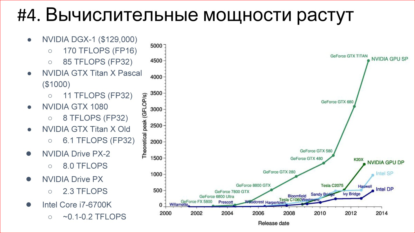 Это картинка 2013 года, когда топовая видеокарта была 4,5 TFLOPS. Сейчас новый TITAN X — это уже 11 TFLOPS. В общем, экспонента продолжается!