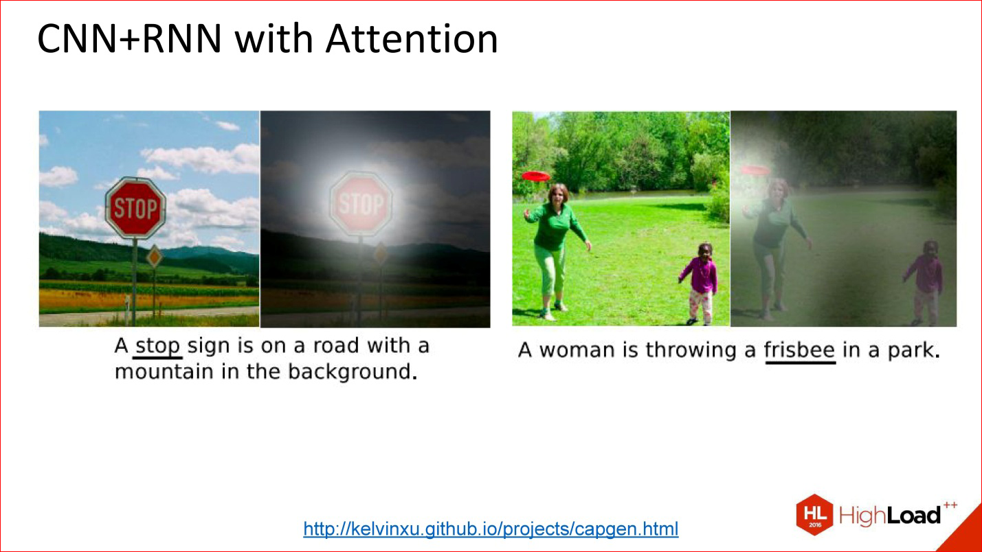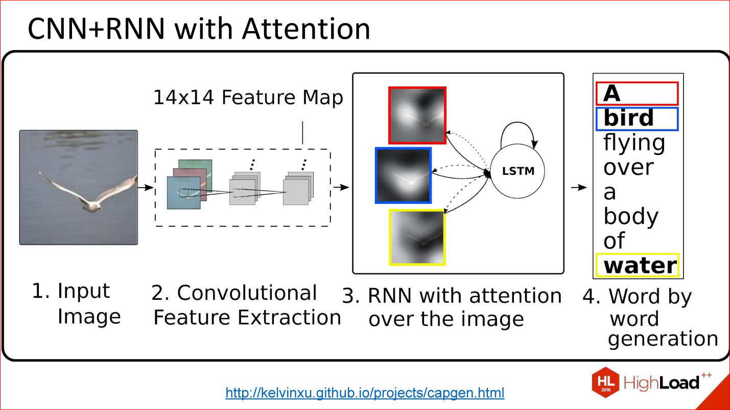 Дополнительный бонус таких сетей. На рисунке представлено совмещение 2 разных нейросетей: сверточная нейросеть, из которой мы получили какие-то признаки, дальше рекуррентная нейросеть текст генерит. Если мы реализовали концепцию внимания, натравили на какие-то картинки, потом можем посмотреть при генерации конкретного слова, какие веса были большими. Это фактически говорит о том, какие пиксели изображения в конкретный момент сыграли свою роль для генерации этого конкретного слова. То есть на что нейросеть как бы обратила внимание.