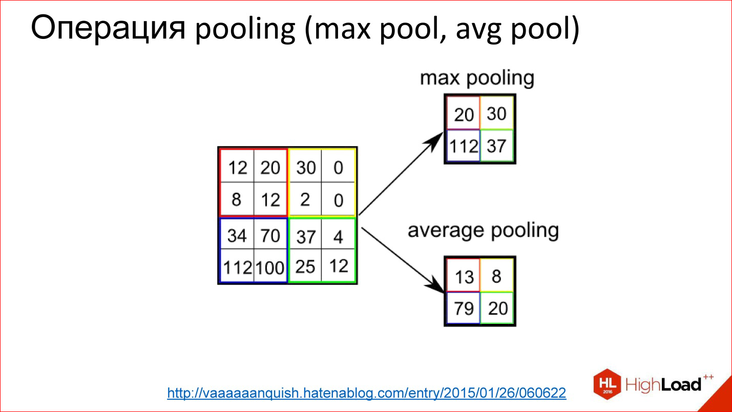 Операция Pooling — еще более простая операция. Это просто усреднение либо взятие максимума. Она тоже работает на каких-то небольших квадратиках, например, 2*2. Вы накладываете на изображение и, например, выбираете максимальный элемент из этого квадратика 2*2, отправляете на выход.