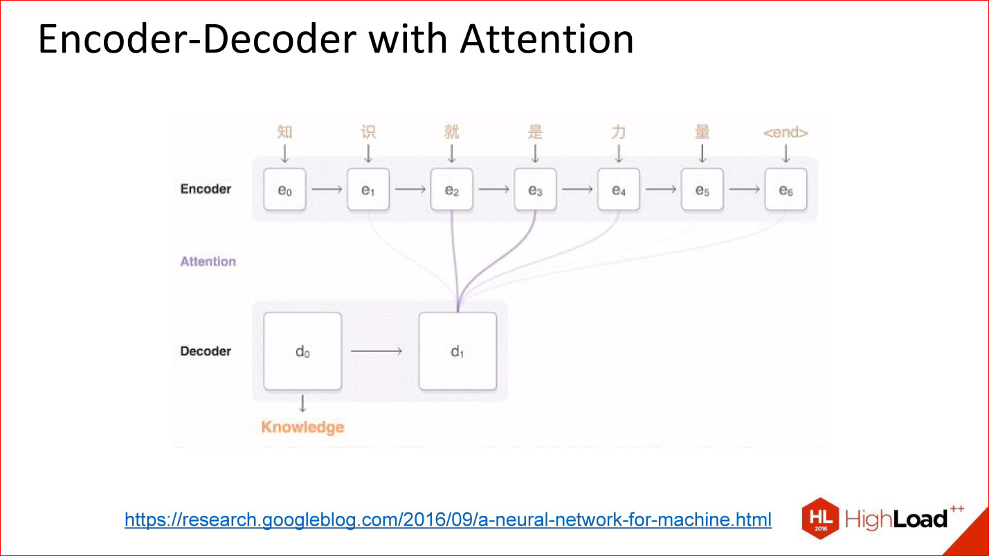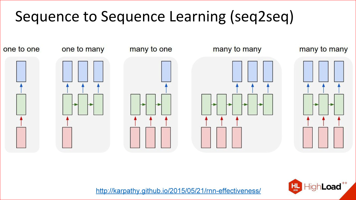 На рисунке представлены все варианты Sequence 2 Sequence Learning, и это очень мощная парадигма. Она мощна тем, что если внутри нейросети все дифференцируемо — а нейросети, которые мы обсуждали, все внутри насквозь дифференцируемы, это значит, что вы можете обучать нейросеть, так сказать, end-to-end: подали на вход одни последовательности, на выход другие, а что происходит внутри, вам вообще не важно. Нейросеть сама справится — на вход куча примеров на английском, на выход — куча примеров на французском – отлично, она сама обучится переводу. Причем действительно с хорошим качеством, если у вас большая база данных и хорошие вычислительные мощности, чтобы все это прогнать.