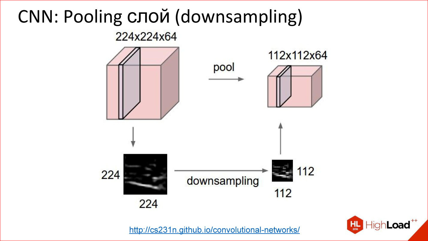 Таким образом вы уменьшили изображение, но не хитрым Average, а чуть более продвинутой штукой — взяли максимум. Это дает небольшую инвариантность к смещениям. То есть вам не важно, какой-то признак нашелся в этой позиции или на 2 ps вправо. Эта штука позволяет нейросети быть чуть более устойчивой к сдвигам изображения.