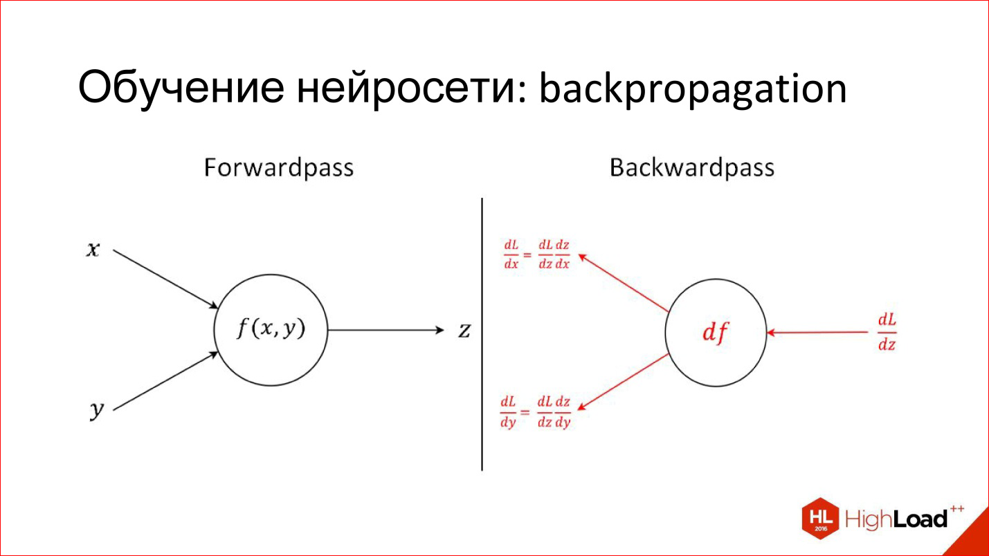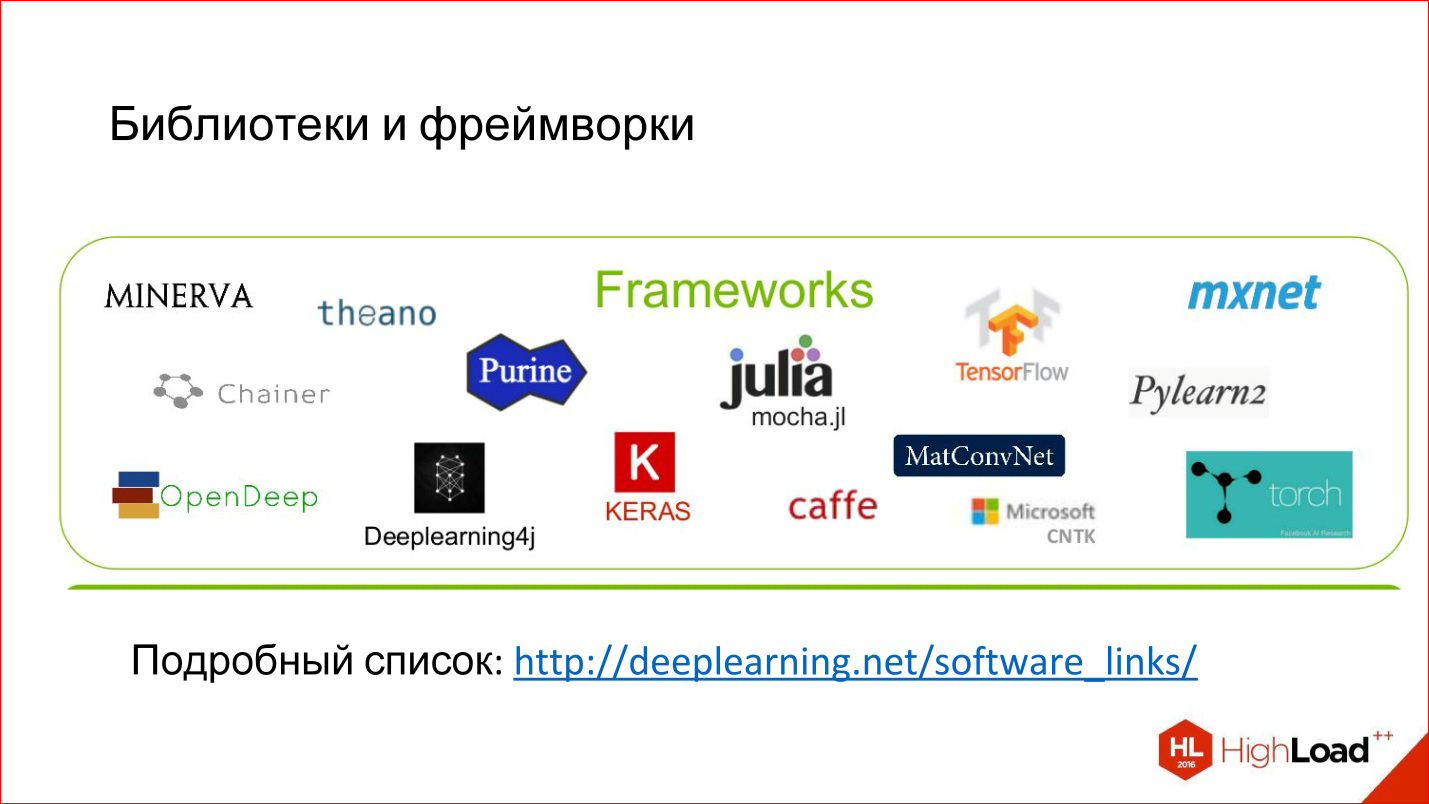 Есть библиотека Theano — ее сейчас немножко потеснил TensorFlow, но вокруг Theano построено много разных классных высокоуровневых оберток — нейросеть можно написать в несколько строчек. Это прямо очень здорово!
