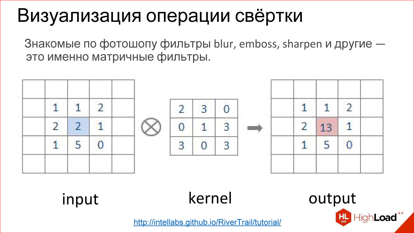 Что такое операция свертки? Это всех пугает, но на самом деле это очень простая вещь. Если вы работали в Photoshop и делали Gaussian Blur, Emboss, Sharpen и кучу других фильтров, это все матричные фильтры. Матричные фильтры — это на самом деле и есть операция свертки.