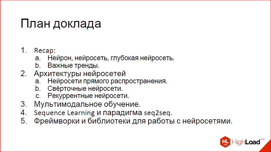План доклада такой. Сначала небольшое введение про то, что такое нейрон, нейросеть, глубокая нейросеть, чтобы мы с вами общались на одном языке.