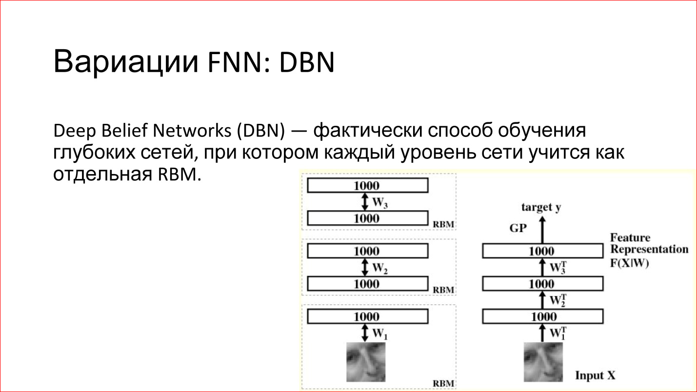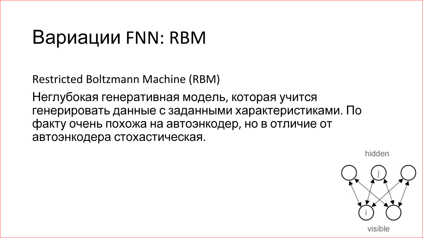 Есть еще интересная модель RBM. Я ее написал в вариации FNN, но на самом деле это не правда. Во-первых, она не глубокая, во-вторых, она не Feed-Forward. Но она часто связана с FNN-сетями.